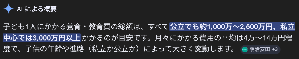 また、子供ができた場合の養育・教育費は、約1,000万〜3,000万円以上(進路による)かかるのが目安とのこと。実際に子供ができたら払うが、”無理してでも子供を作って払いたい”とは思わない。※引用元リンクはこちら。